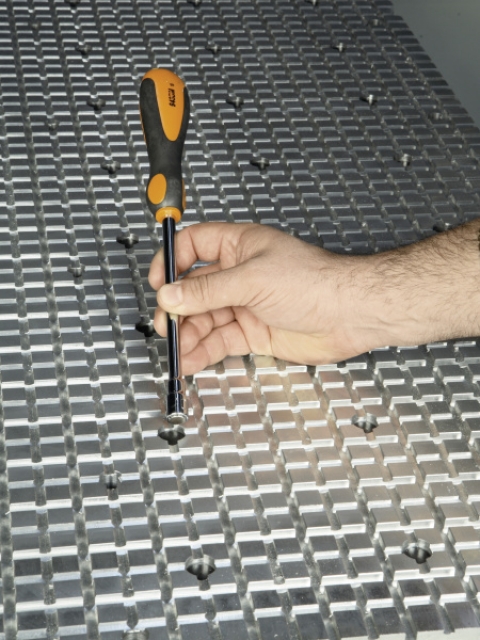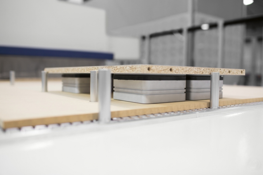 Rastrový pracovní stůl vyrobený z odolné ALU slitiny lze použít pro upnutí desek v celé ploše anebo obrobků na přísavkách.